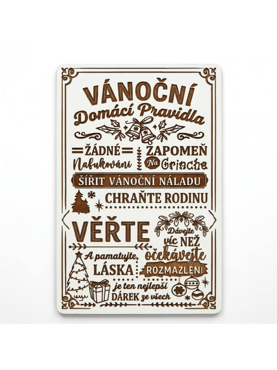 Líbí se vám tento sváteční motiv, ale máte specifické přání? Jako přímí výrobci vám nabízíme zakázkovou úpravu dekorací. Pokud chcete k pravidlům přidat jméno vaší rodiny (např. „Vánoční pravidla rodiny Novákovy“), upravit font, nebo mírně změnit text, jsme tu pro vás. Stačí vaše požadavky uvést do poznámky v košíku, nebo nás kontaktovat předem. Rádi pro vás vyrobíme vánoční dekoraci přesně podle vašich představ.
