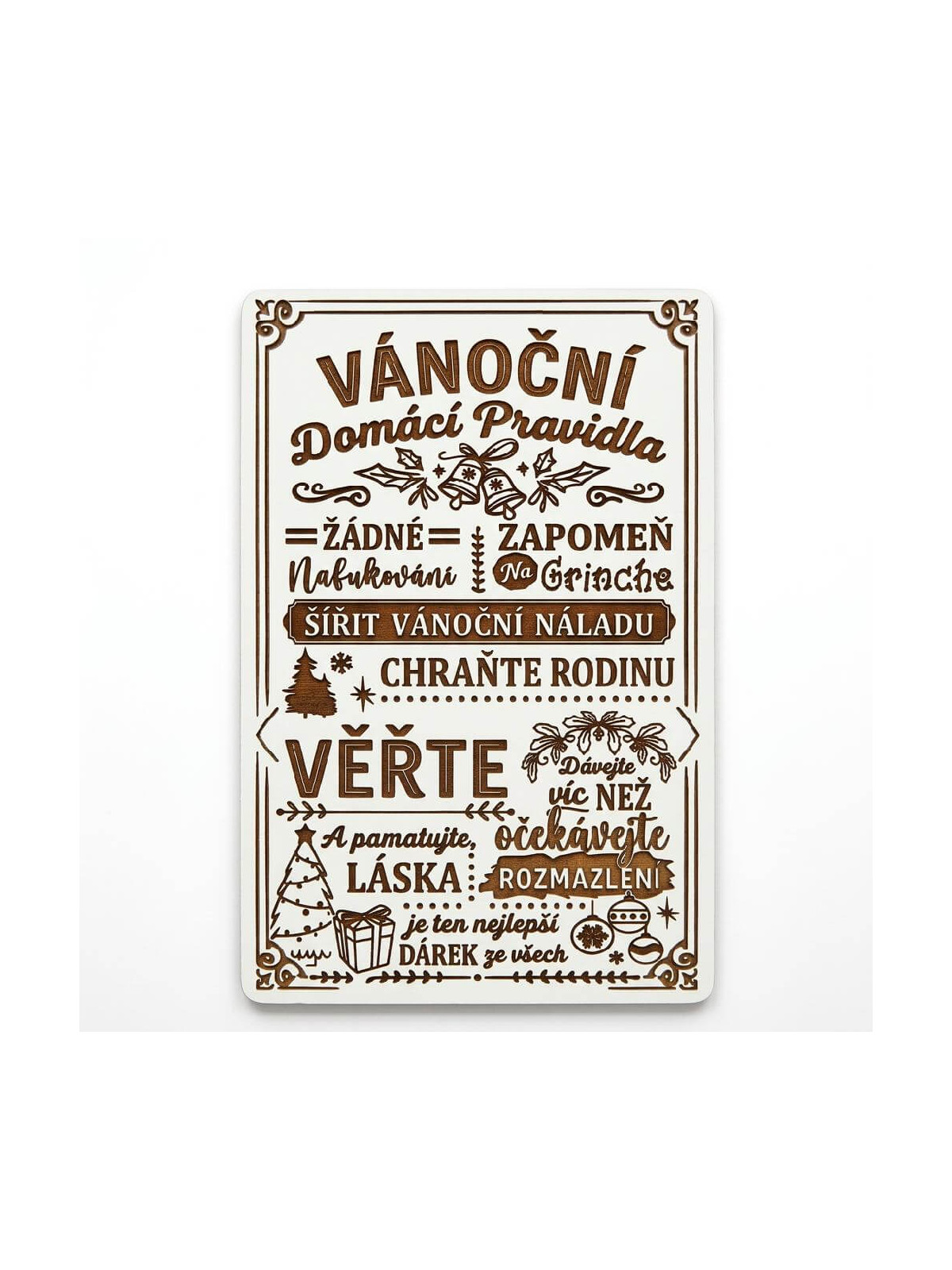 Naše závěsná vánoční dekorace na zeď (či poličku) je vyrobena z pevné bílé MDF desky s precizně hladkým povrchem. Text a decentní sváteční orámování v jemném vintage stylu jsou aplikovány pomocí moderní technologie laserového gravírování. Gravír je prováděn pouze povrchově (nejde do hloubky), což zaručuje krásný, čistý a elegantní vzhled. Světle hnědá barva vygravírovaného dřeva nádherně kontrastuje se sněhově bílým podkladem. Díky tomuto neutrálnímu zbarvení zapadne cedulka do moderních, minimalistických i tradičních rustikálních interiérů.