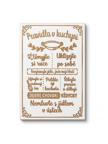 Naše závěsná dekorace na zeď (či poličku) je vyrobena z pevné bílé MDF desky s precizně hladkým povrchem. Text pravidel a decentní orámování v jemném vintage stylu jsou aplikovány pomocí moderní technologie laserového gravírování. Gravír je prováděn pouze povrchově (nejde do hloubky), což zaručuje krásný, čistý a elegantní vzhled. Světle hnědá barva vygravírovaného dřeva nádherně kontrastuje se sněhově bílým podkladem. Díky tomuto neutrálnímu zbarvení zapadne cedulka do moderních, minimalistických i tradičních rustikálních kuchyní.